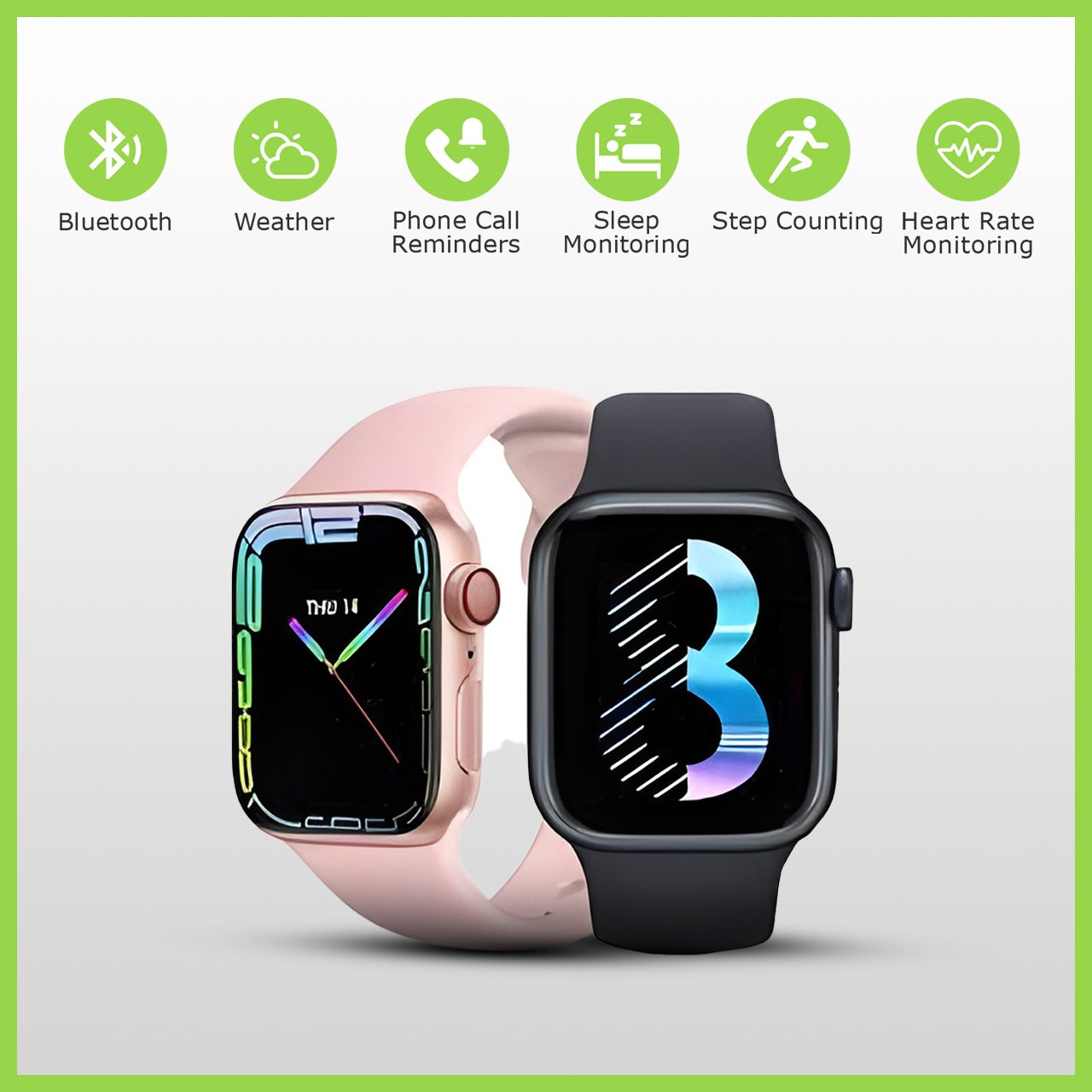 Three rings of health、Heart Rate/Blood Pressure/Oxygen 、BT call、BT Music、ECG monitoring、Sleep monitoring、call reminder、SMS Alerts、Social APP Message Reminder、Alarm clock reminder、A sedentary reminder、sport、Turn the wrist and shine the screen、Looking for bracelets、Looking for Phones、Remote Photography、Do Not Disturb、Dial customization、Flight mode, common contacts, Siri, music control, weather, etc