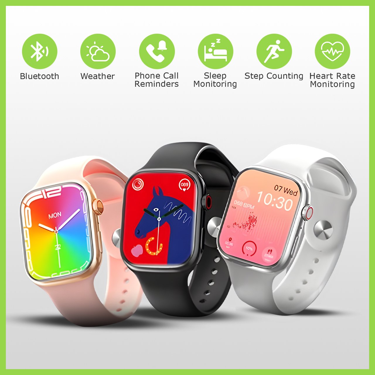 Three rings of health、Heart Rate/Blood Pressure/Oxygen 、BT call、BT Music、ECG monitoring、Sleep monitoring、call reminder、SMS Alerts、Social APP Message Reminder、Alarm clock reminder、A sedentary reminder、sport、Turn the wrist and shine the screen、Looking for bracelets、Looking for Phones、Remote Photography、Do Not Disturb、Dial customization、Flight mode, common contacts, Siri, music control, weather, etc